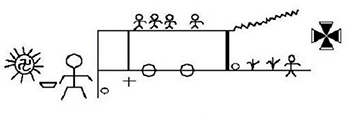 高级生命所开辟的生命之路,分为下面窄些的与自然和谐融洽的连续生命之路,以及上面宽些的一条白人的科技成果之路。十字之上,两条路之间的竖线指白人的到来,十字是基督教义,十字下的小圆圈代表连续不灭的生命循环。